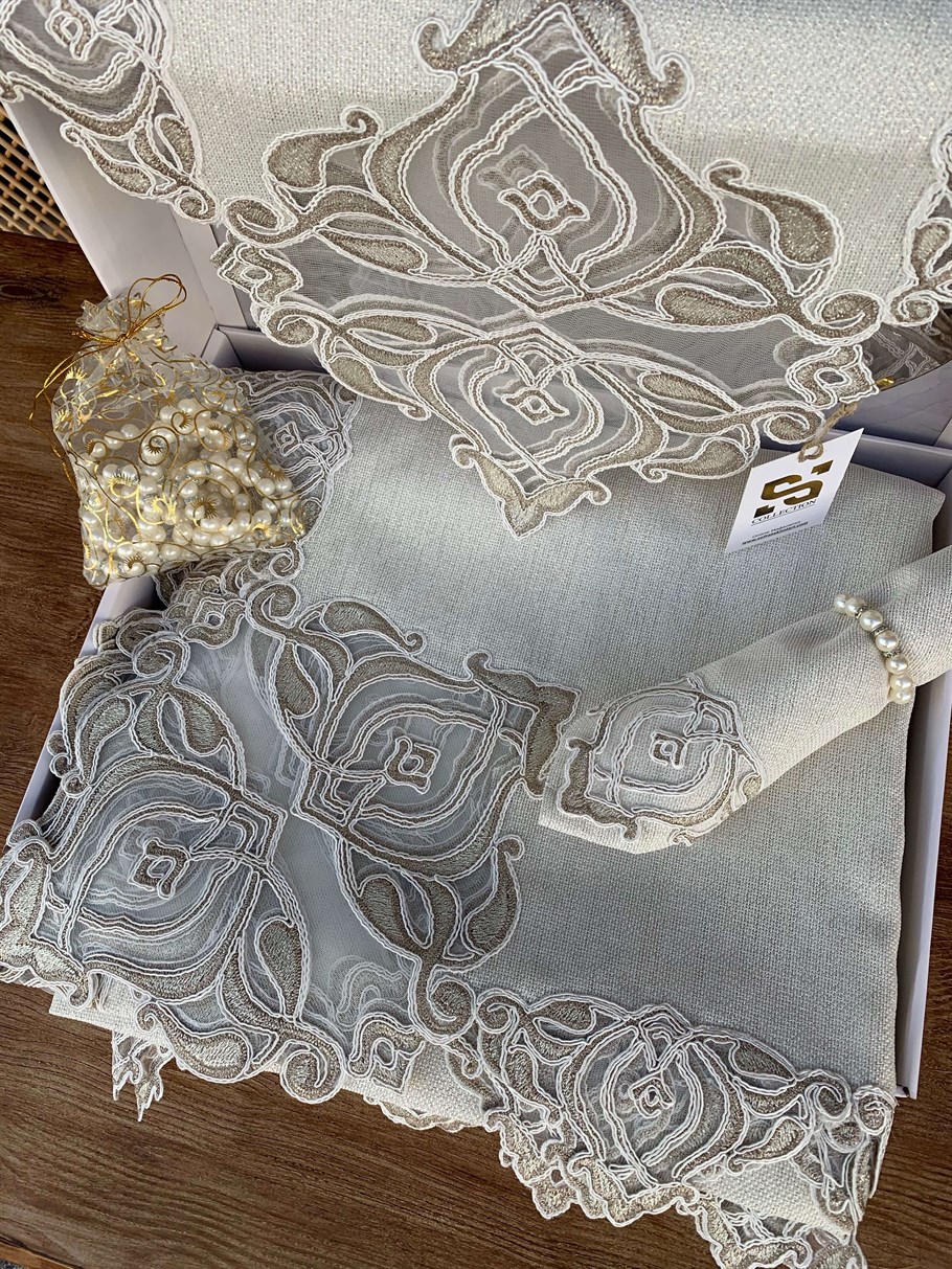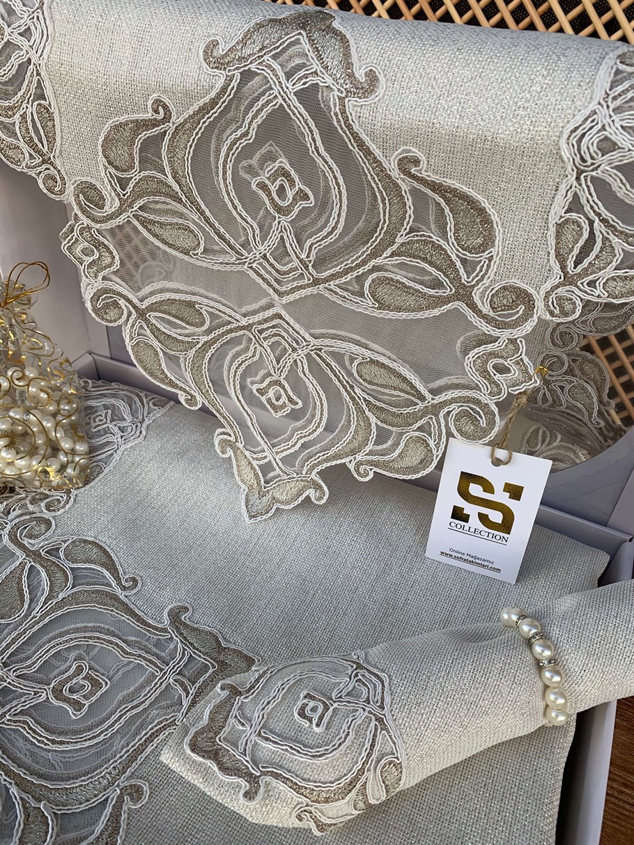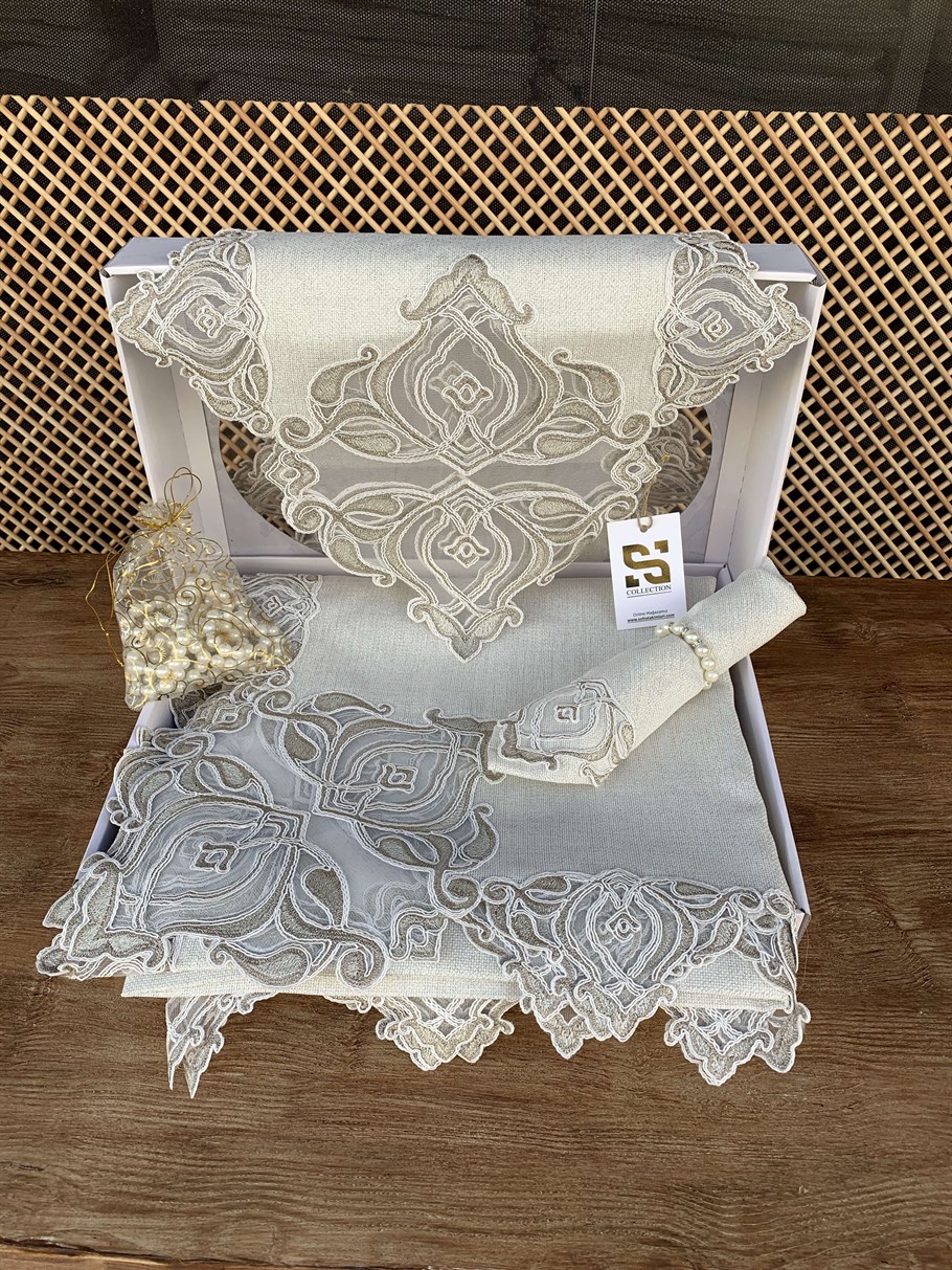 Sunumlarınıza zarif ve estetik bir görünüm kazandırmaya ne dersiniz? Göz alıcı gipür tasarımıyla öne çıkan, ve leke tutmayan Sim Işıltılı Linen kumaştan üretilen Burç Lüx Masa Örtüsü Takımı favoriniz olacak.